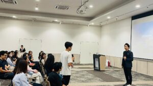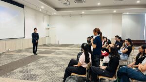 Tại buổi tham quan, sinh viên đã được ông Suzuki Atsuyuki – Giám đốc AEON Mall Hà Đông trực tiếp chia sẻ về lịch sử phát triển, triết lý kinh doanh và định hướng chiến lược của AEON Mall Hà Đông trong quá trình mở rộng tại thị trường Việt Nam. Qua phần trình bày, các bạn hiểu rõ hơn về các mô hình chiến lược hướng đến việc tạo ra không gian sống tiện ích, thân thiện và bền vững cho cộng đồng.